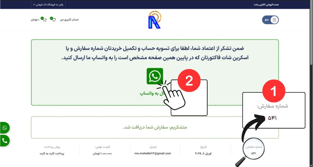 ۴. مطابق با تصویر زیر، شماره سفارش خود (که با عدد ۱ مشخص شده) را به واتساپ ما (که با عدد ۲ مشخص شده) ارسال کنید.